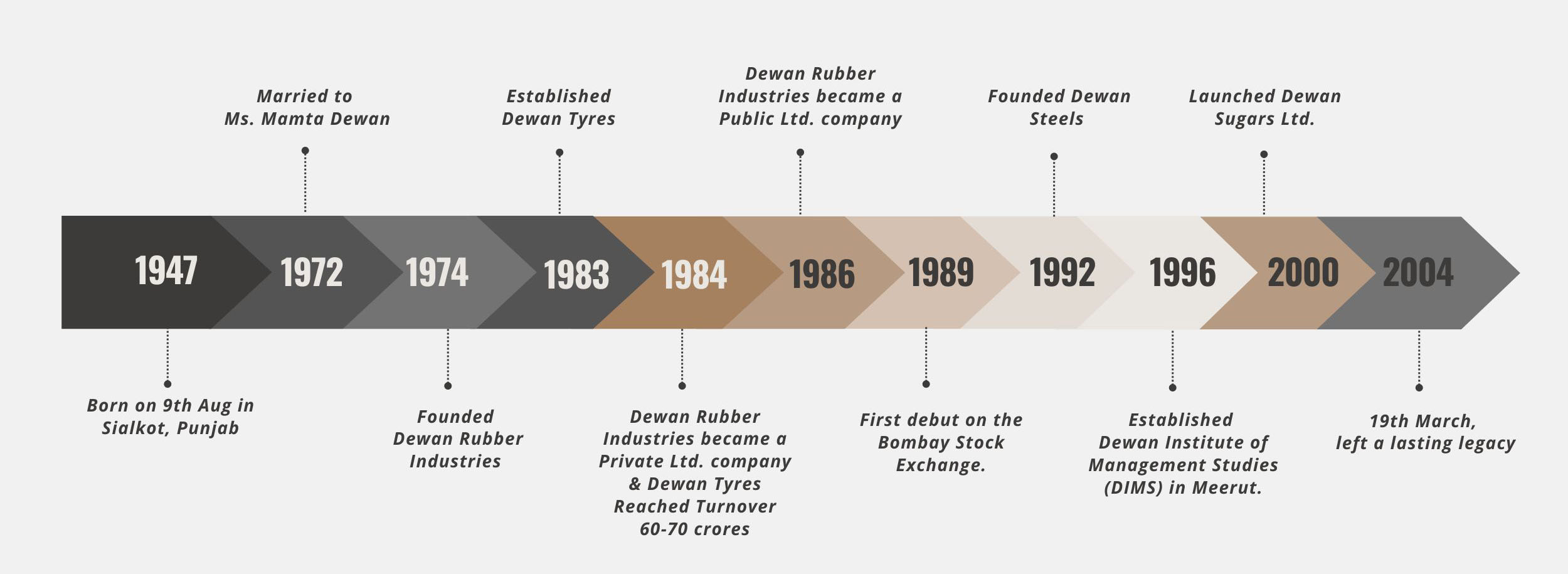 Shri. Vidya Sagar Dewan was a pioneering entrepreneur, philanthropist, and visionary whose influence extended across multiple domains. Recognizing the crucial role of transportation in a nation's progress, he embarked on creating a lasting industrial legacy by venturing into tyre manufacturing with indigenous technology. This led to the establishment of the Dewan Group of Industries, a diverse conglomerate including Dewan Rubber Industries Pvt. Ltd., Dewan Tyres Ltd., Dewan Steels Ltd., Dewan Sugars Ltd., and more.